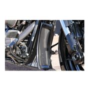 The Black Stash Chin Spoiler for M8 Softails is a handcrafted motorcycle accessory, delivered with a smooth primer finish ready for scuffing and painting. The product effortlessly mounts onto the bike as a direct bolt-on, eliminating the need for any modifications. Included with the spoiler are the necessary installation hardware and a perforated aluminum grill. Crafted in Paul Yaffe's Phoenix-based factory, the chin spoiler employs a specialized 3-D hand-laid composite method, ensuring the produced components are not only robust but also thoroughly refined in quality.