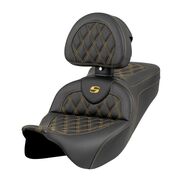 The Roadsofa seat is meticulously designed for long-distance touring enthusiasts who prioritize all-day comfort. It features Gelcore Technology for both the rider and passenger, which is unique to Saddlemen and provides a smooth, therapeutic ride by managing energy through a proprietary mechanical process. Unlike standard seats, which typically rest on the cover, the split-cushion lumbar area is engineered for riders to sit into the Gelcore, enhancing comfort over extended periods on the road. Crafted from Saddlehyde, this seat material offers an optimal blend of aesthetics, rider comfort, and long-lasting durability. With its leather-like grain and softness, Saddlehyde incorporates a level of stretch that boosts the effectiveness of the gel and foam elements for added comfort. Saddlemen's progressive approach to comfort is also evident in their Progressive Density Foam, the result of in-depth research and practical experience. The precision-engineered chemical composition ensures a perfect equilibrium between firm support and plush compliance. Encased in a water-resistant skin that reinforces the seat's endurance, the foam features varied cell sizes and types, all contributing to the Roadsofa's reputation as the ultimate seat for the long haul.