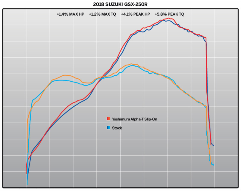The Yoshimura Alpha T Slip-On Exhaust's styling, fit and finish are the result of combining decades of hands on racing experience and state-of-the-art materials with the latest in digital design capabilities. One look at an Alpha Exhaust and you know it’s something special! The Works Finish is not a coating, but a media blast finish using Yoshimura's own special recipe of ingredients. The result is an exhaust that, after it goes through a heat cycle on the motorcycle, takes on unique coloring that looks much like those works components Yoshimura's factory racers use.