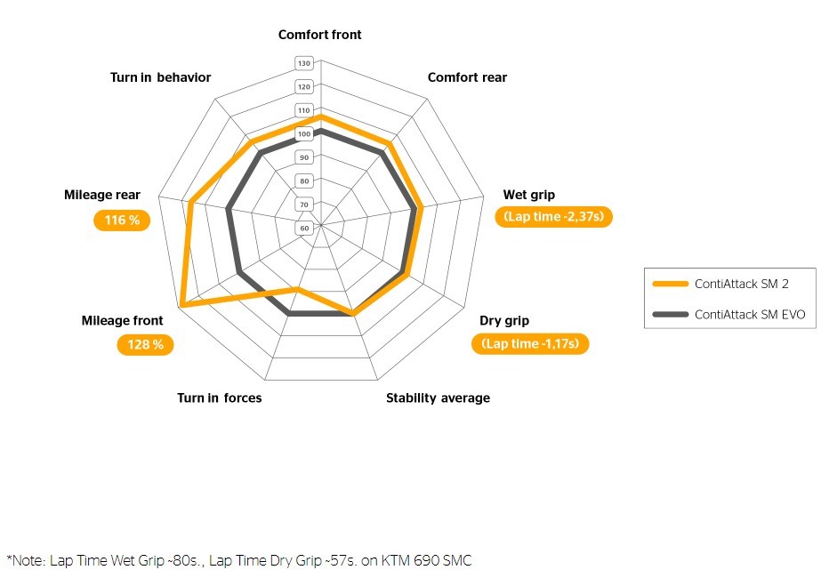 The Continental ContiAttack SM2 Supermoto Tires deliver performance virtually mirroring Continental's most extreme DOT supermoto tire (the ContiAttack SM Supermoto EVO) but with enhanced comfort, wet grip, and longevity. The ContiAttack SM2 features a tread design and composition that draw from Continental's experience in track-only racing tires. Continental Grip Limit Feedback technology boasts large areas of slick, uninterrupted tread block to provide road feel and predictable grip. Rear tires feature a reinforced, longer-wearing center section to handle the hard acceleration and braking demands of Supermoto - while also contributing to increased tire life for non-track riding. Infused with Continental's BlackChili compound, the ContiAttack SM2 Tires cater to both competitive on-track supermoto styles and everyday street riding requirements.